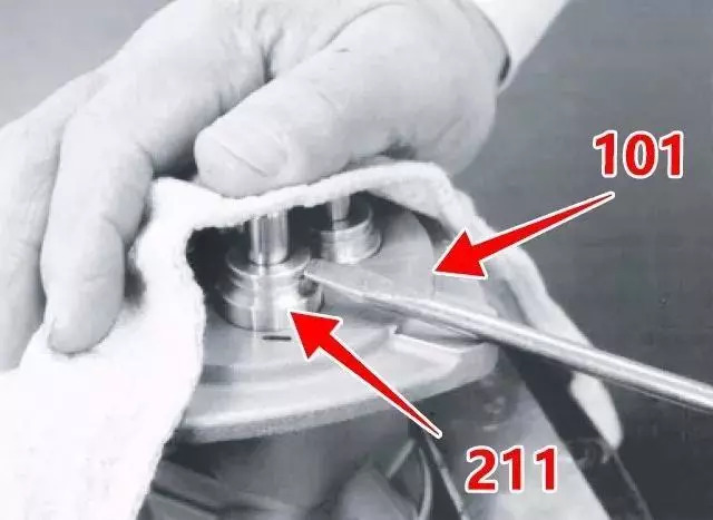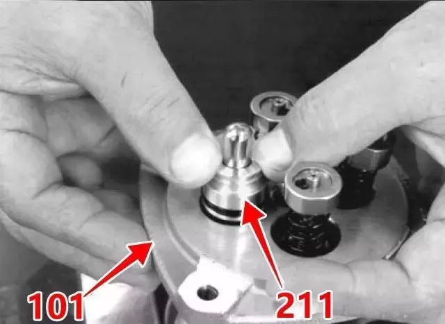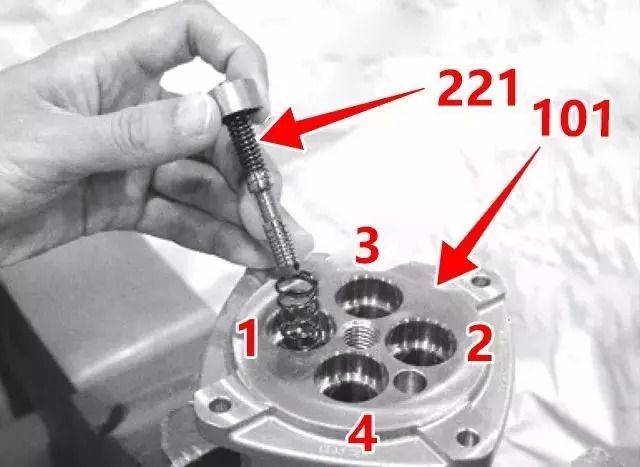 3、將彈簧(221)裝入殼體(101)的端口1、3中,并將減壓閥總成裝入其中,然后將彈簧(221)裝入殼體的端口2、4中。此時(shí)應(yīng)將未分解的總成分別裝入4個(gè)孔中。