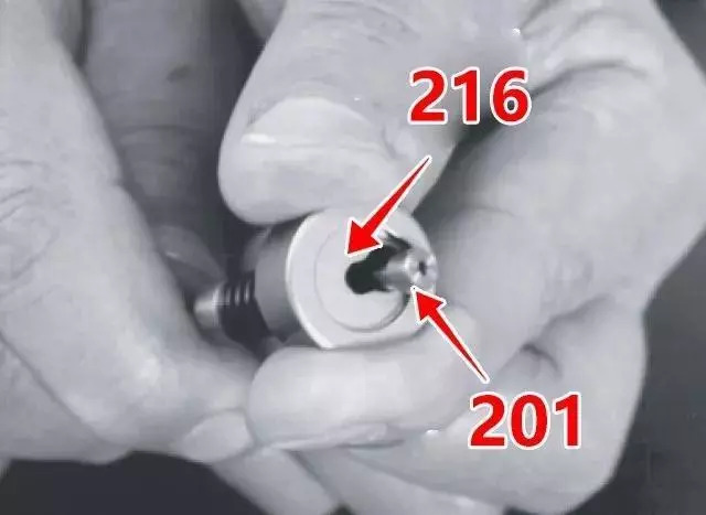 4、壓縮彈簧座(216),按壓彈簧(241),使閥芯(201)的頭部穿過彈簧座的打孔,將其拆下。
