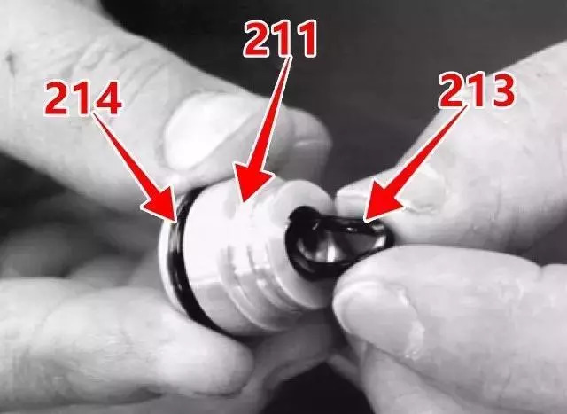 3、依次從殼體內(nèi)拆下推桿(212)、堵頭(211)、減壓閥總成(閥芯)、回位彈簧(221)。