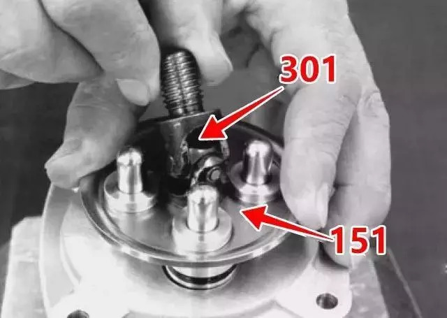 5、將堵頭總成安裝到殼體內(nèi),彈簧彈力較強(qiáng)時(shí),將板(151)裝上后,用手按住板的同時(shí)固定4個(gè)堵頭,臨時(shí)緊固接頭(301)。