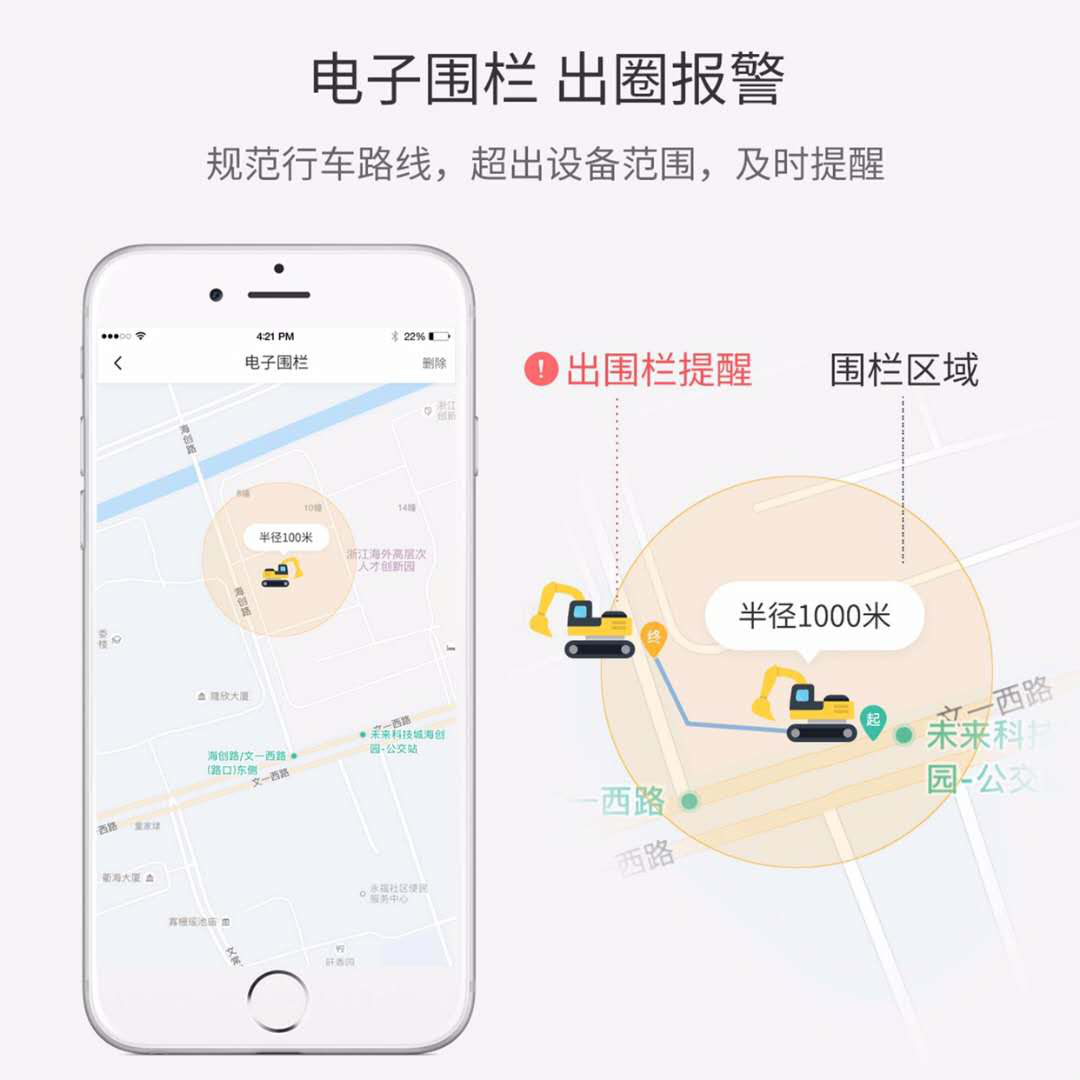 具有電子圍欄功能,出圈報(bào)警,協(xié)助挖友管理設(shè)備的行駛范圍,規(guī)范司機(jī)行車路線,當(dāng)設(shè)備超出設(shè)定的工地范圍后,及時(shí)提醒。