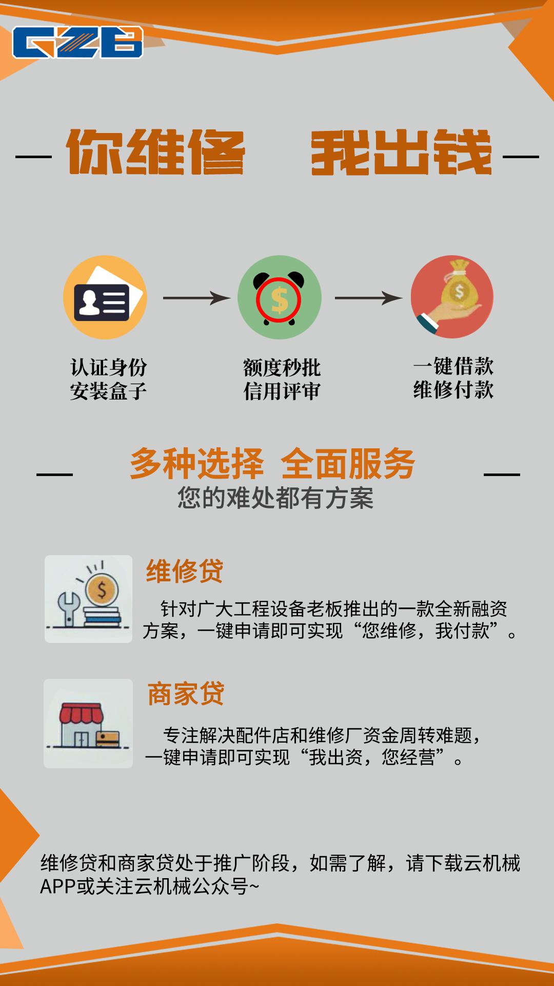 另外,云機(jī)械云盒根據(jù)不同的用戶,給予多種選擇。針對(duì)廣大挖機(jī)老板推出維修貸,一鍵申請(qǐng)即可實(shí)現(xiàn)你維修,我出錢。